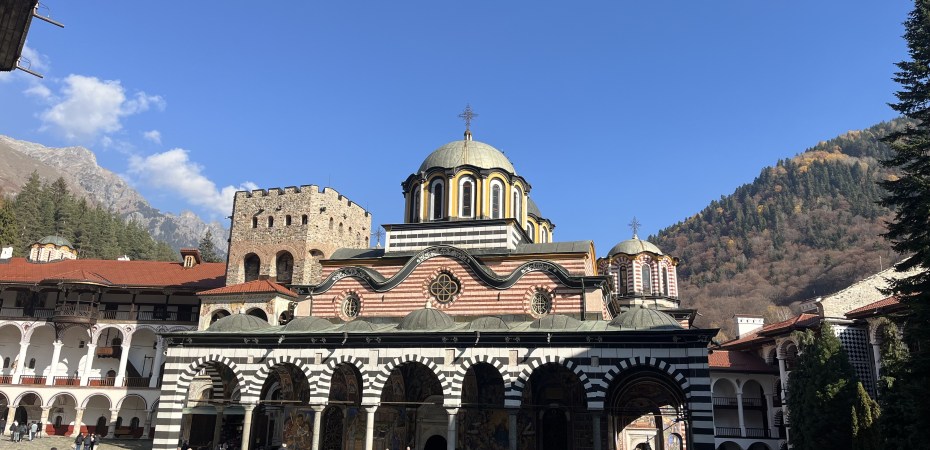 Finally, after a windy drive up the mountain, we eventually saw the Rila Monastery in all its beauty. Nestled in a perfect spot where the mountains and forest met, the monastery worked harmoniously with nature, rather than against it. The place was naturally packed with tourists, and we found ourselves following the crowd to find something to eat. Noticing the sign that said ‘Traditional Bulgarian Breakfast’ we were wooed by the smell of the pastry. Richly decorated with icing sugar, we devoured them quickly. We also tried their ‘milk’, which was closer to a yoghurt rather than milk, but was fresh, tasty, and full of diary. We finally proceeded through to the monastery. It was a truly sacred experience. Outside the cathedral, many cats could be found, clearly strays that were fed by the monks. The monastery itself was richly decorated in frescoes presenting various biblical and theological stories.