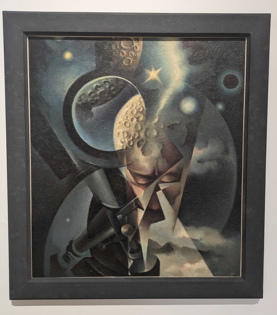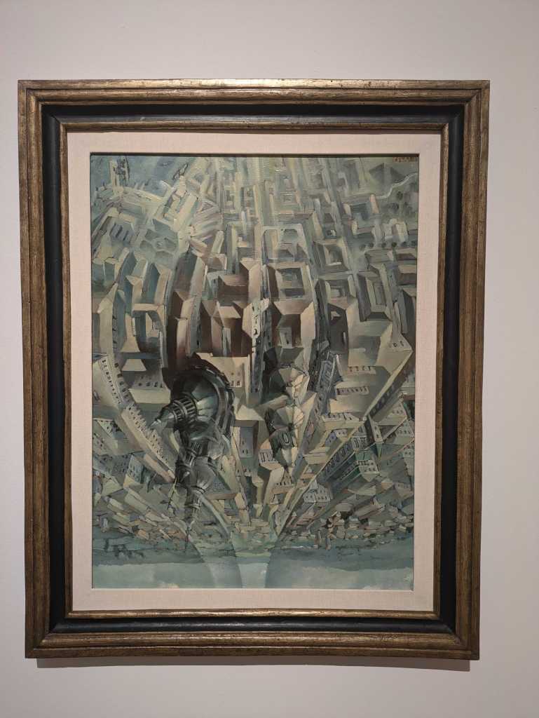 But in this, the exhibition presents one with the genius of Tulio Crali, who kept the torch of Boccioni alive in the 1930s in such works as Man and Cosmos (1933-1934). In this painting we see that same spirit of exploration we saw earlier as the human mind looks both down the microscope and up through the telescope. He continues his journey into aeropainting itself with Inception-style paintings like Great Overturned Vault (1938), where the world is twisted and stretched under the pressure of speed itself. Surely Crali lived up to the ideals of aeropainting.