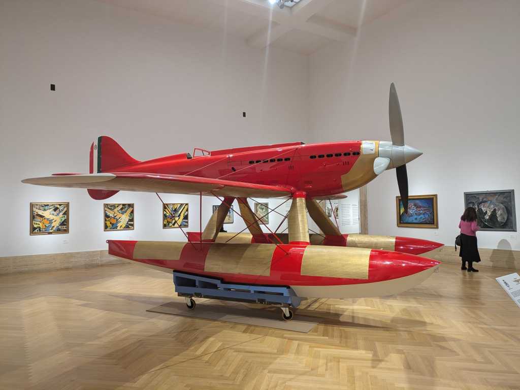 The exhibition dramatically communicates through the inclusion of a huge Macchi Mc-72 sea-plane – this is due to the absolute mania for aviation in Italy in the 1930s. All of the remaining Futurists, including Marinetti, seem to have seen within Italy’s race towards air power an opportunity to break the chains that hold down the human spirit: