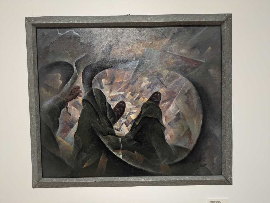 Balla is at his best here when he adds some symmetry and harmony to his abstractions, such as the Expansion of Spring (1918), where beautiful, rounded forms come together in organic shapes, as if one is seeing a flower as pure radiation. Spirituality becomes more important to Futurists after this point and one can see why in the aftermath of the war. The painters of this period never abandon their futurist philosophy but there seems a clear change of focus that the show brings out well. I couldn’t help seeing in the paintings a glimpse of Evola archetypes and timeless alien forms coalescing and diverging in metaphysical symphonies. It’s as if the young philosopher was giving his inscrutable ideas physical shape, trying to reflect upon a broken world.