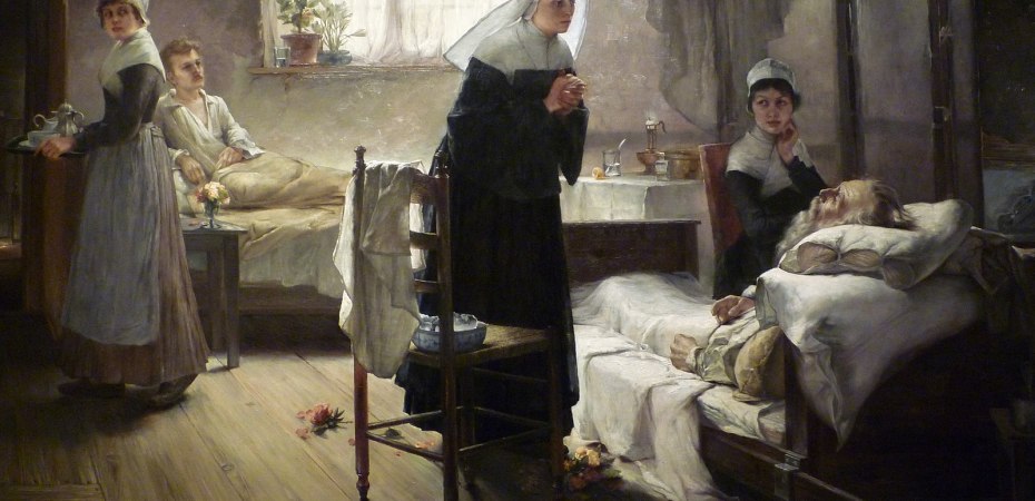 She considers as she works the contrast between her bronze skin tone and his, which is pale and green with worry.