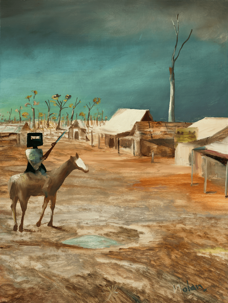 This wasn’t the only less than pleasant or honourable choice made by Nolan. He deserted from the army during WW2. Whilst granted leave in 1944 he failed to return to the army, and instead used a pseudonym and went to live with the Reed’s at Heide. It was during this time that he saw an exhibition of Ned Kelly’s armour in Melbourne and remembered that his grandfather had been part of the group of police officers that had chased the famous bandit down in 1879. Perhaps his own illegal status led him to take the story of Kelly to heart as from this point he began his famous series of Ned Kelly paintings.