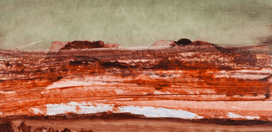 This is the world presented to us by the landscape paintings of the Australian painter Sidney Nolan. His canvases were moulded by this landscape. Rarely taking to them any other colour than red, yellow, and blue, the paintings are purely concerned with the elemental. It is a world of pure colour and form. Not a geometrical form of classical or abstract art but a form moulded by the forces that shape nature itself — earth, wind, and heat. Nolan, with his paint, guides us through these apathetic forces as they erode rock, reflect the baking sun’s relentless light, and as heat cracks the earth. What little life survives out here is no more than bracken and bush. Matchstick-like trees poke out the ground, tiny dry shards of organic life.