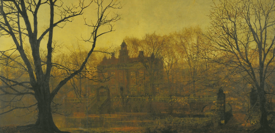 They passed beyond the gates, shaded by the gloom of ancient yews, their feet muffled on a thick carpet of shed needles. The lanes through Mottram St Andrew grew silenter still, all the mists and cobwebs natural to a Cheshire noon in this season being brushed away by the sun, which, nevertheless, already seemed to be embering, so that every stone and oak and dying, gilded leaf took on a hue of deeper and decaying gold. Through the tops of trees, they caught glimpses of the Edge, whose topmost houses carved in relief upon the sky the white mass of their gables—their lighted windows and gilt weathercocks visible even at a good mile’s distance.
