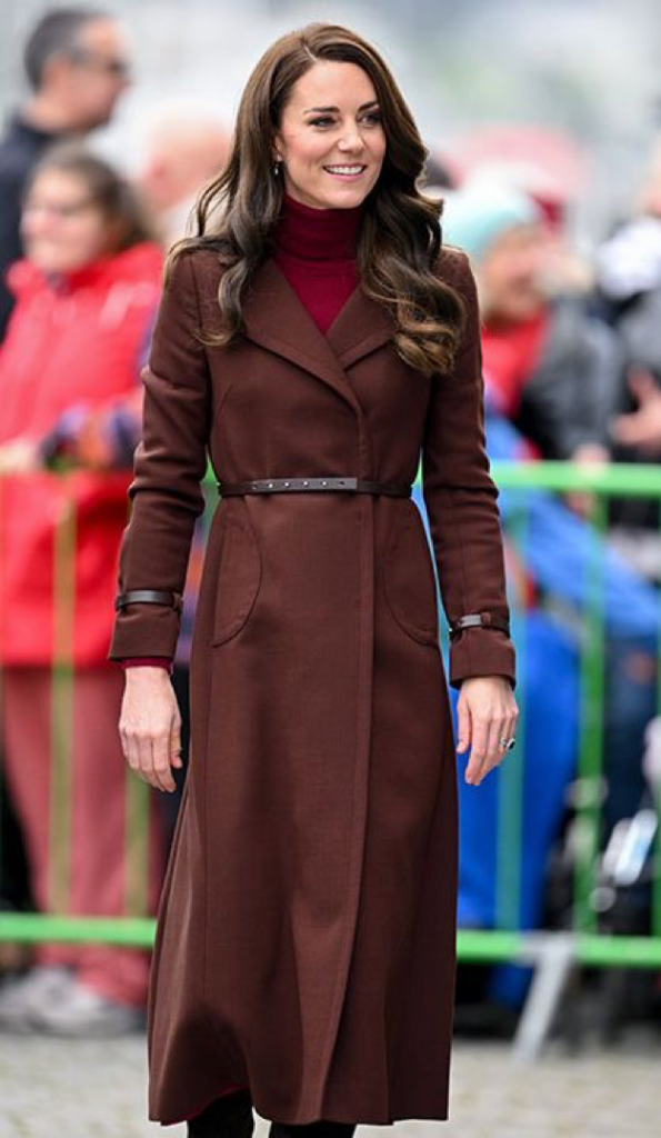 We don’t get a lot of Kate in brown, but she wore this Hobbs coat on her first trip to Cornwall as Princess of Wales. I like how it suits her dark red dress and turtleneck top.