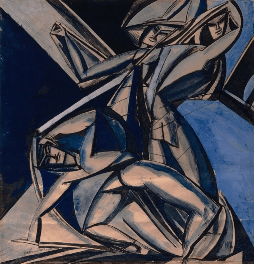 So, where AngloFuturism boldly promises to fuse tradition (‘Anglo’) with Futurism, for Lewis, there is no inherent distinction; hence, no need to romanticise or make a fuss about the ‘Futurist’ half of the equation. It was, in fact, as an act of secession from Italian Futurism that Vorticism established its more ‘English’ identity. While Lewis, like Marinetti, demanded that art be “organic with its time,”2 Vorticism’s aesthetic philosophy—in contrast to Futurism’s hot-blooded, Latin, and “feverish” bluster about the dynamism of modern life (speed, war, and technology)—was immobile, hard-edged, cold-blooded, and ‘Northern.’ Its primitiveness was ‘detached.’ Whereas Futurism felt the machine age “from within, ” Vorticist art regarded its dynamism from the “outside, critically”3—think Troilus and Cressida compared to The Iliad.