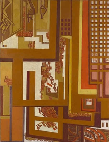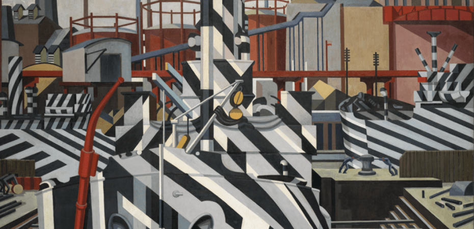 The dictionary defines a vortex as a whirling mass of water or air, and one might presume, from subsequent references to lines of flow, spirals, curves, and rings, that a movement calling themselves Vorticists would have produced an art that was certainly curvilineal and possibly soft-edged, evoking the fluidity and rotation characteristic of whirlpools and whirlwinds. Yet Vorticism—in contrast to the swirling patterns and compositional turbulence of Futurism—adhered to a rigidly geometrical, sharply delineated aesthetic of “diagonals, zig-zags and verticals.”37 Rejecting Futurism’s machine-idolatry and its proto-accelerationist exaltation of speed and change, the Vorticists, as Marshall McLuhan observed, instead sought to “arrest the flux of existence” so that the observer could be “united with that which is permanent.”38 As opposed to the “sentimental Future” as it was to the “sacripant Past,”39 Vorticist art “plunges to the heart of the Present”40 to create an aesthetic concretisation of time that momentarily disrupts the “insistent, hypnotic” rhythm of the mechanical world around us.41