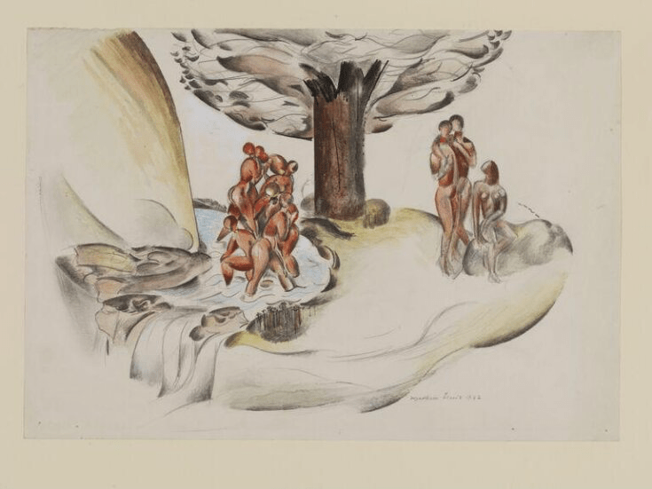 Lewis, of course, was alive to this charge, as evidenced by a series of late-career ‘sea images’, nudes and bathers, painted in the mixed idiom of “pure-abstraction-and-stylized-nature”80 (he even pronounced the death of purely abstract art in 1939 and declared himself a “super-naturalist”)81. Yet this collection of brilliant watercolours, with their cloudy, watery spaces and huge, floating marine shapes—regarded by Walter Michel as the “imaginative and gayest” of Lewis’s career and his most ‘human art’ to date82 — only make plain what Lewis had always considered to be the true relation between the artist and nature. He held the traditional view of imitation as working in the way nature works, with all the “beauty of accident”, but without the “certain futility that accident implies,”83 so that art becomes, in a sense, another nature.