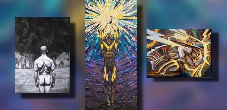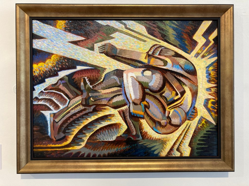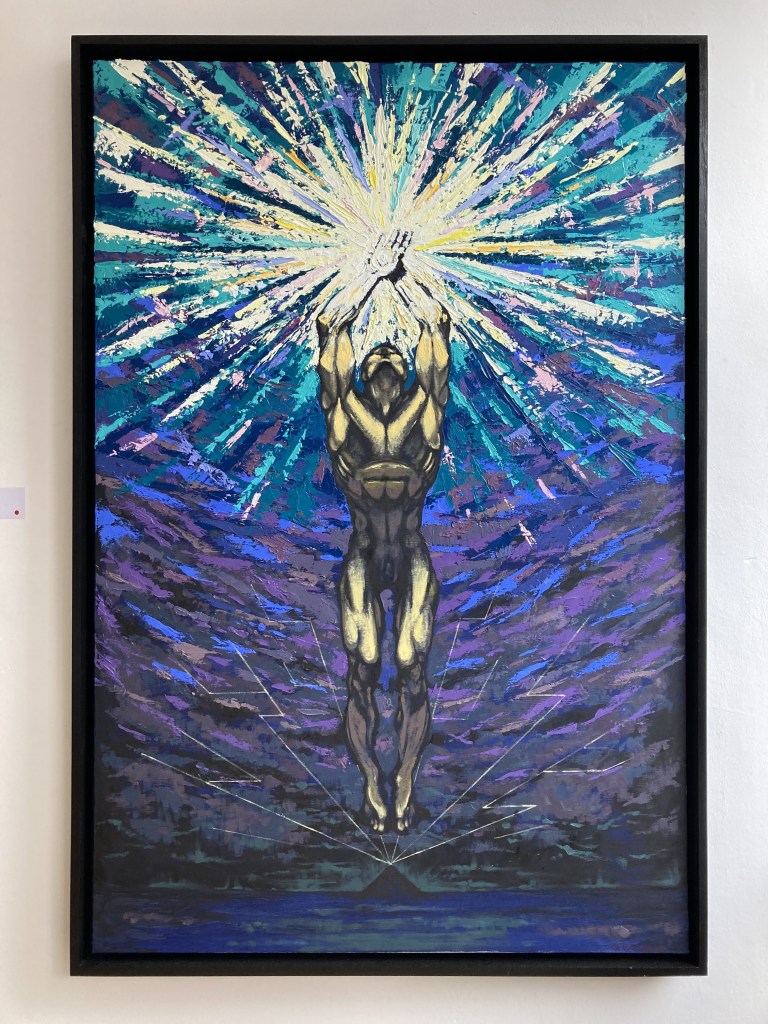 The explosion of colour on a large canvas was electrifying, just like the energy in the gallery, the buzz of the conversation, the cigarette smoke, and the sharp festive smell of brut. Prometheus, the one who brought fire to the people, stretching his arms upwards, the muscular body highlighted in its peak Übermenschian glory. Rejected by the gods, hanging in the limbo of time and space, he nonetheless shines bright, bringing hope to humankind. This is, naturally, Samuel Wild’s masterpiece, which is also the poster image for the ‘Power and Intimacy’ exhibition taking place in London. There’s ecstasy in every brushstroke which could be easily missed if not seen in person. The fire is heavily textured, which adds expression; and the shape of the body is heavily accentuated, akin to pastel work, which is Samuel’s forte. The painting uses oil as a medium, and this confluence of methods and styles makes his work reach new heights.