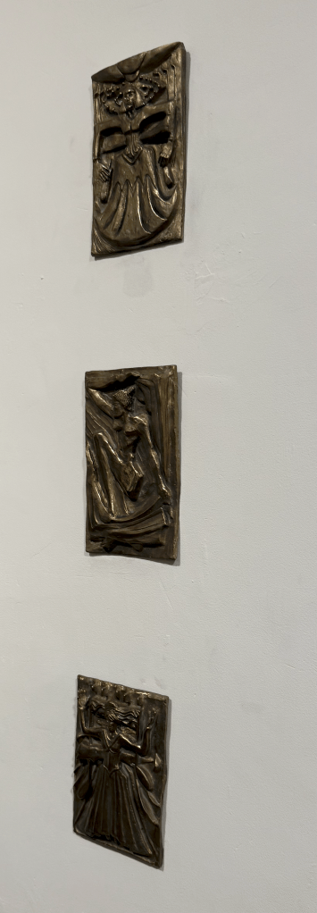 However, in my frenzy, I continued, moving away from comforting pastels and casting a glance at the other side of the room, where stood Ferro, the man known for his tapestries and sculptures. Sporting a Russian-style hat and a uniform, he guided us through the works, relishing in the opportunity to explain the symbolism of treasures on display. Across the wall, there sprawled a large tapestry with a gryphon and near the window, a large Byzantine-inspired double-headed eagle rested, bejewelling the rest of the room. But what really got my attention were the muses — three bronze plates representing a muse for a different discipline. I will leave it to the reader to guess what they symbolise for the air of mystery, but I will say, there are sounds, stars, and movement captured within them.