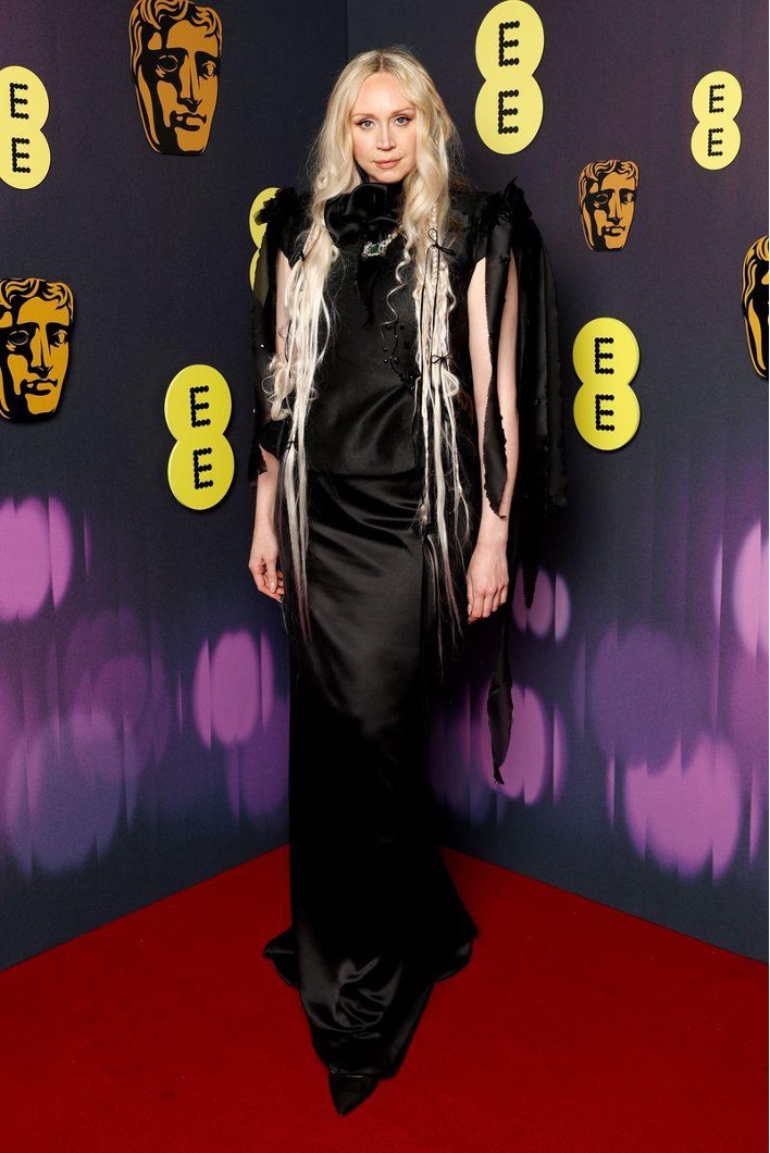 Ms. Christie has gone for a rather Gothic look, perhaps in keeping with her role in Wednesday. She looks great, but the sleeves look as though they’ve been through a shredder.