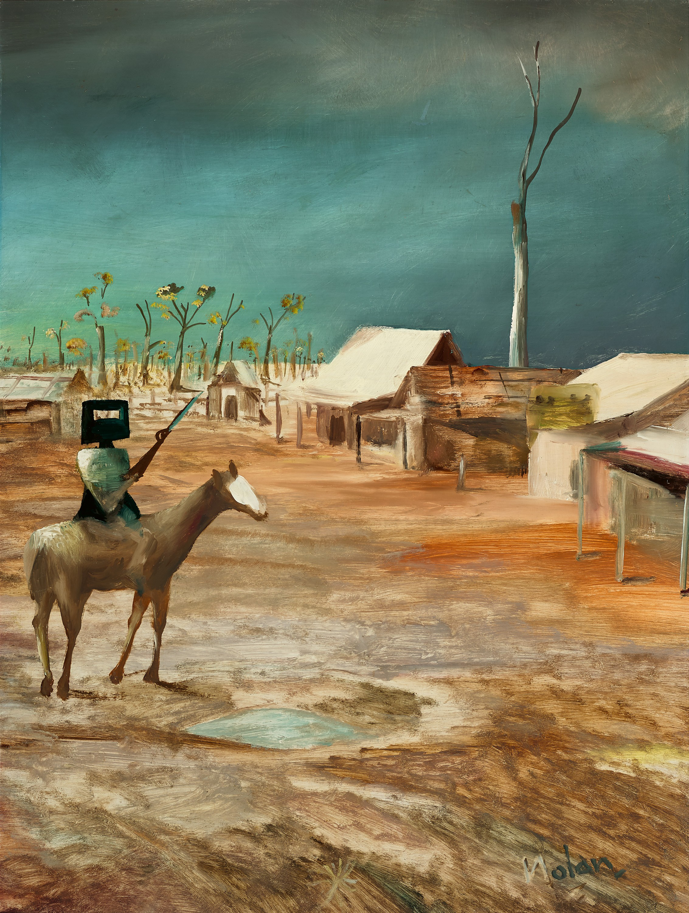 In his painting Nolan represents Kelly as a totemic and mythological figure, represented by his armoured square head. The post-cubist icon roams the outback, on horseback, gun in hand. To start Nolan illustrates points within the Kelly story — the robberies and cop-murders. It is evident that Kelly is the only being in these paintings that can navigate the red land of central Australia. As his paintings progress not only does Nolan depict the biography of the man, his Ned starts to merge with the overpowering force of the Australian desert. The bandit is longer a figure in the landscape — a common theme in Western art — but becomes the landscape. Kelly’s soul becomes an essential part of that mix of transcendent forces and he morphs into a kind of god of the outback.