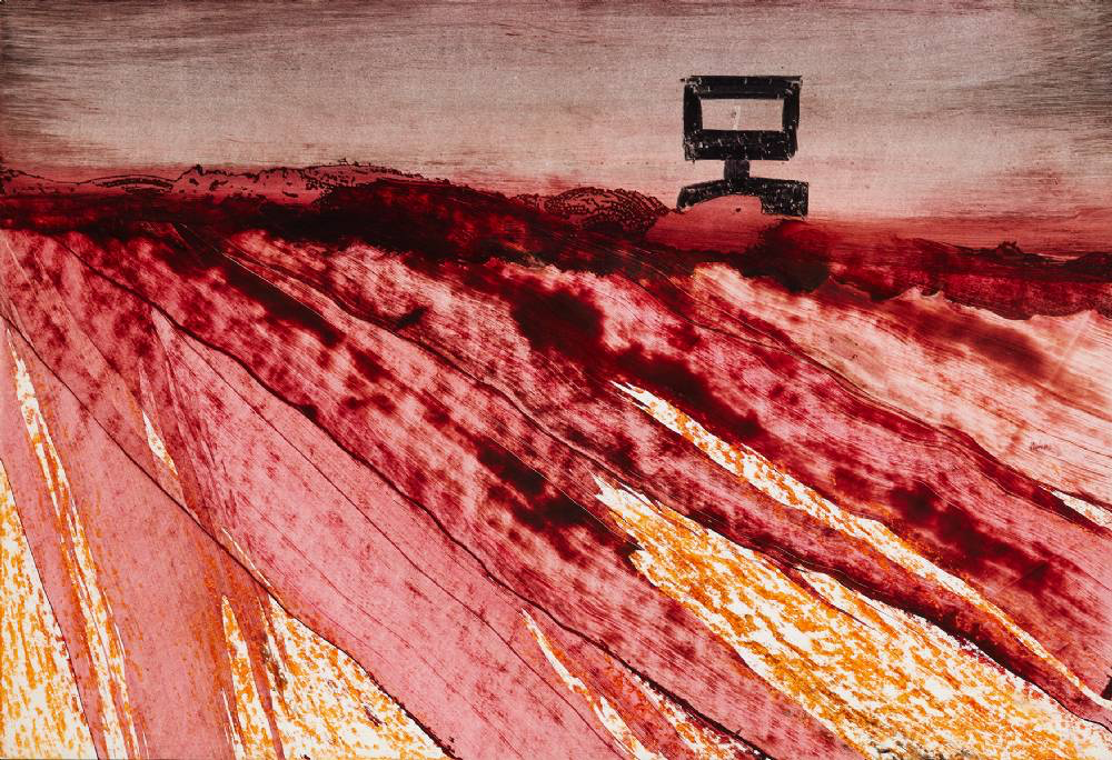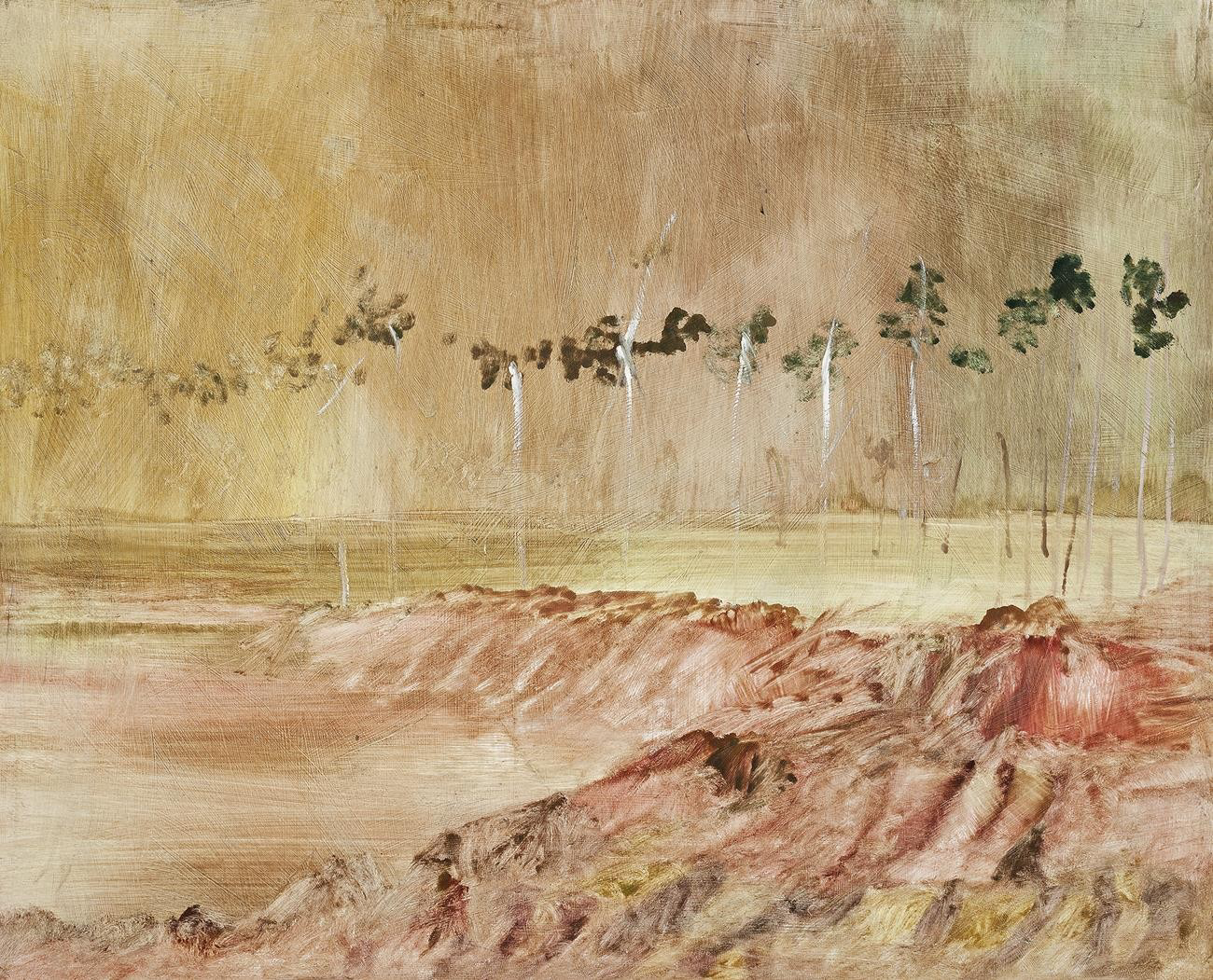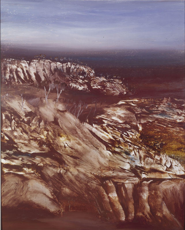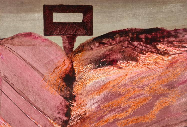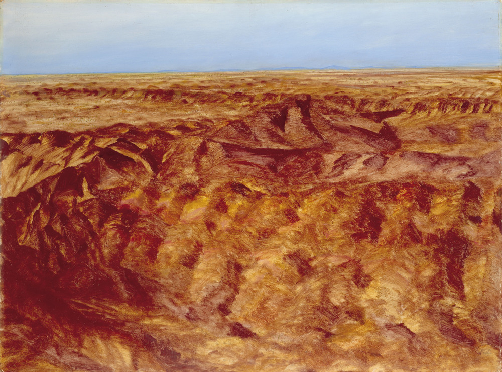 This is the world presented to us by the landscape paintings of the Australian painter Sidney Nolan. His canvases were moulded by this landscape. Rarely taking to them any other colour than red, yellow, and blue, the paintings are purely concerned with the elemental. It is a world of pure colour and form. Not a geometrical form of classical or abstract art but a form moulded by the forces that shape nature itself — earth, wind, and heat. Nolan, with his paint, guides us through these apathetic forces as they erode rock, reflect the baking sun’s relentless light, and as heat cracks the earth. What little life survives out here is no more than bracken and bush. Matchstick-like trees poke out the ground, tiny dry shards of organic life.