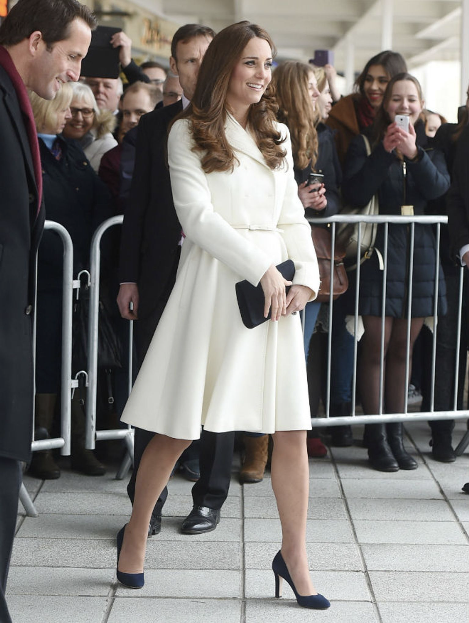 Kate wore this classy and clean knee-length Max Mara coat on a visit to a painting event in Portsmouth. Paired with a black clutch bag and navy heels for colour, she looked absolutely lovely.