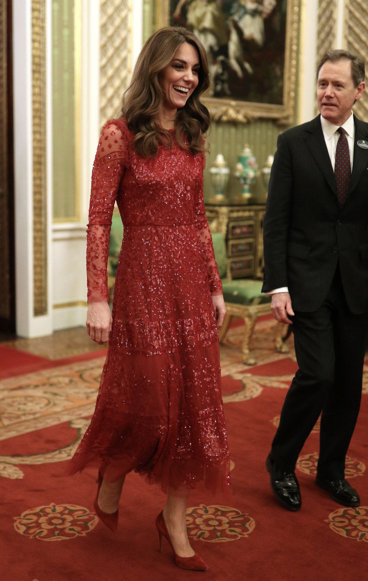 Kate first wore this glittery Needle and Thread number to a summit at Buckingham Palace in January 2020. The red is perfect for someone with fair skin and dark hair like Kate, and is classy without being stuffy. I love the sparkle too! I personally think that Kate looks best with her hair long and wavy too. She wore this dress again for a 2022 Christmas Carol service preview.