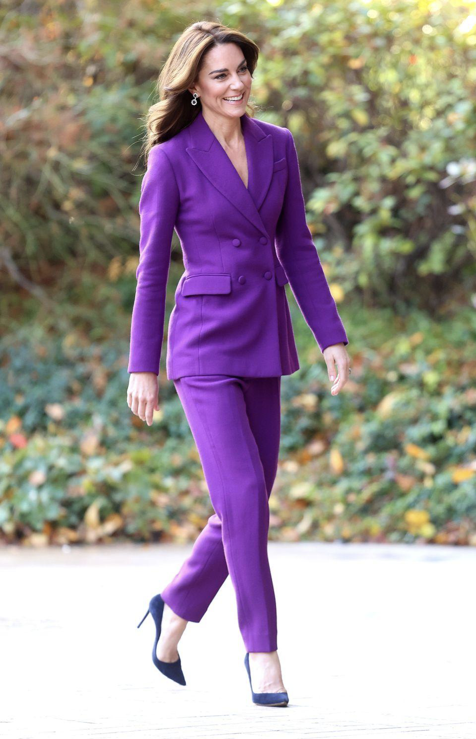 This is one of my favourite Kate looks. She wore this purple Emilia Wickstead number on a trip to Northern Ireland in 2021. Whilst I am a dress girl through and through, I just love this suit. It’s feminine and chic whilst perfectly tailored. The late Queen only allowed women in the inner circle to wear purple, so it was lucky that Kate counted.