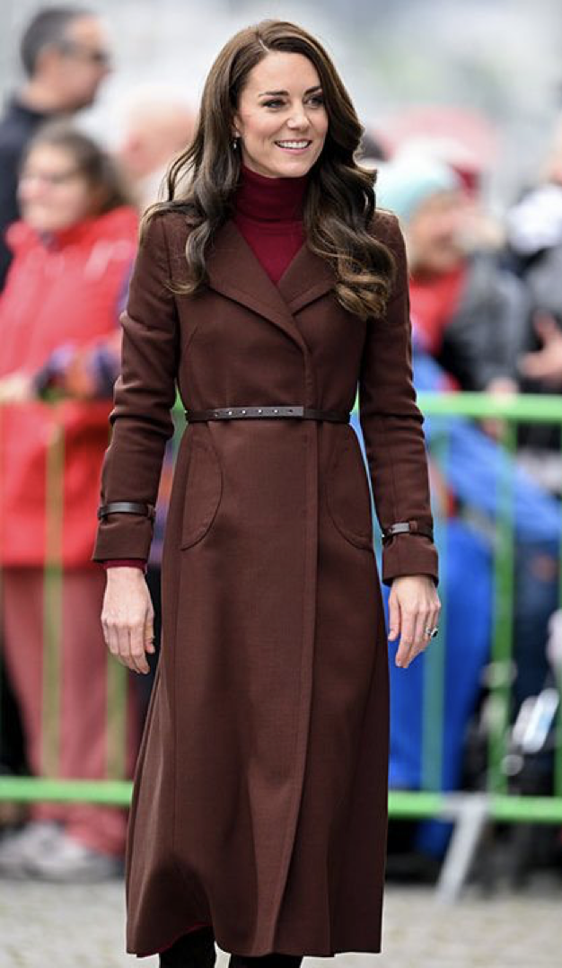 We don’t get a lot of Kate in brown, but she wore this Hobbs coat on her first trip to Cornwall as Princess of Wales. I like how it suits her dark red dress and turtleneck top.