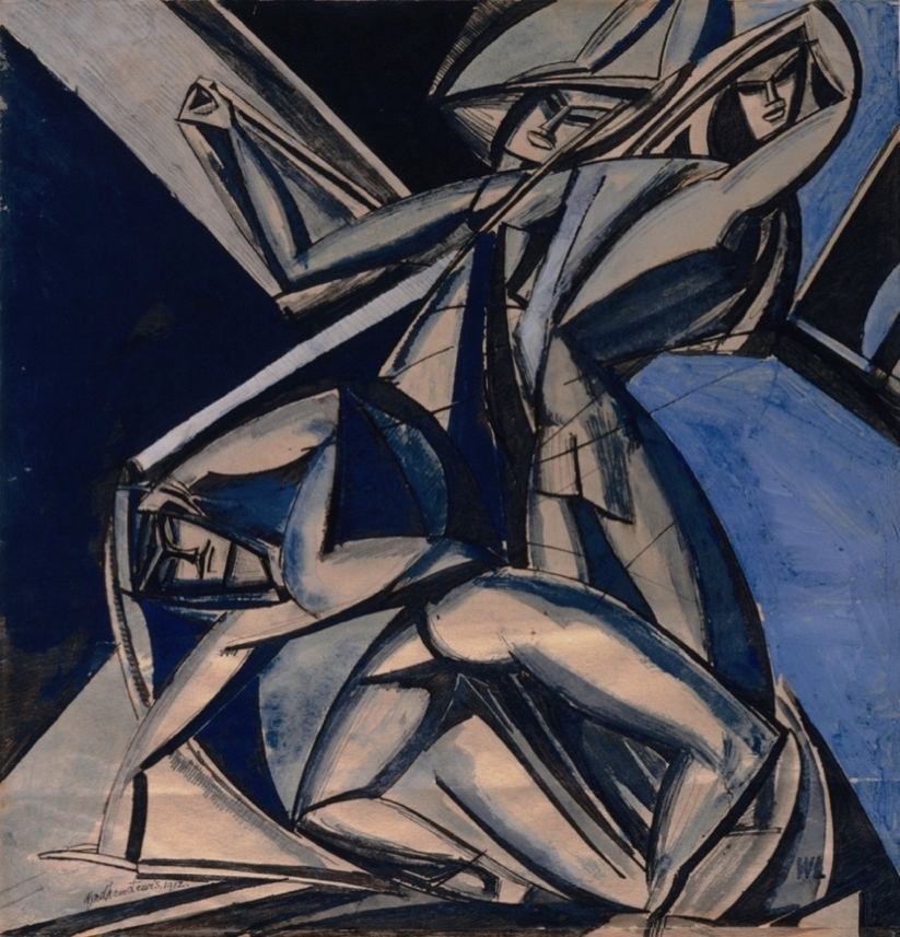 Vorticism’s jagged forms, sharply delimited by straight lines or geometric arcs, thus betokened a classical search for control and rationality in contrast to the fluid and imprecise approach of Futurism, which Lewis considered a continuation of the modernist “disorder” of Nineteenth Century ‘romantic’, ‘revolutionary’, European thought.51