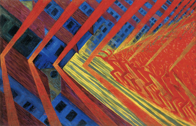 In contrast to Futurism, Vorticism’s jagged forms—sharply delimited by straight lines or geometric arcs—thus signified a classical search for control and rationality, and were a pointed rejection of the fluid and imprecise approach of the Italian avant-garde, which Lewis considered a continuation of the modernist “disorder” of Nineteenth Century ‘romantic’, ‘revolutionary’ European thought.57 Observe how the ‘revolt’ depicted in The Crowd—where the French and Communist flags of the stick figures symbolise the various doctrinaire revolutionary ideologies of modernity—is presented by Lewis not as a vitalistic surge (as seen in Russolo’s painting. but as a mass of busy-bodying automatons “strut[ting] and pant[ing] in insect packs”58, indistinguishable from one another and from the mechanical metropolis that ‘enframes’ them.