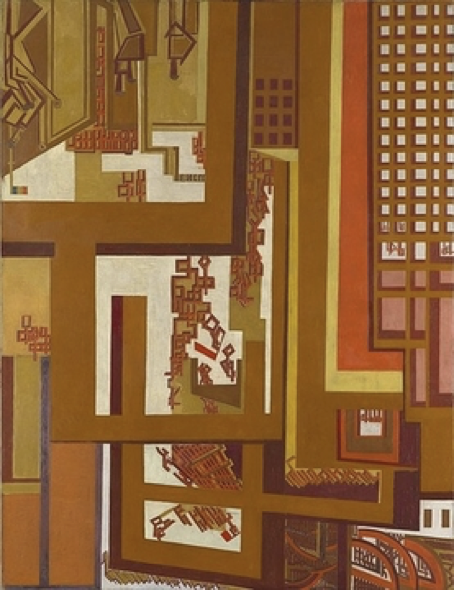 The dictionary defines a vortex as a whirling mass of water or air, and one might presume, from subsequent references to lines of flow, spirals, curves, and rings, that a movement calling themselves Vorticists would have produced an art that was certainly curvilineal and possibly soft-edged, evoking the fluidity and rotation characteristic of whirlpools and whirlwinds. Yet Vorticism—in contrast to the swirling patterns and compositional turbulence of Futurism—adhered to a rigidly geometrical, sharply delineated aesthetic of “diagonals, zig-zags and verticals.”37 Rejecting Futurism’s machine-idolatry and its proto-accelerationist exaltation of speed and change, the Vorticists, as Marshall McLuhan observed, instead sought to “arrest the flux of existence” so that the observer could be “united with that which is permanent."38 As opposed to the “sentimental Future” as it was to the “sacripant Past,"39 Vorticist art “plunges to the heart of the Present”40 to create an aesthetic concretisation of time that momentarily disrupts the “insistent, hypnotic” rhythm of the mechanical world around us.41