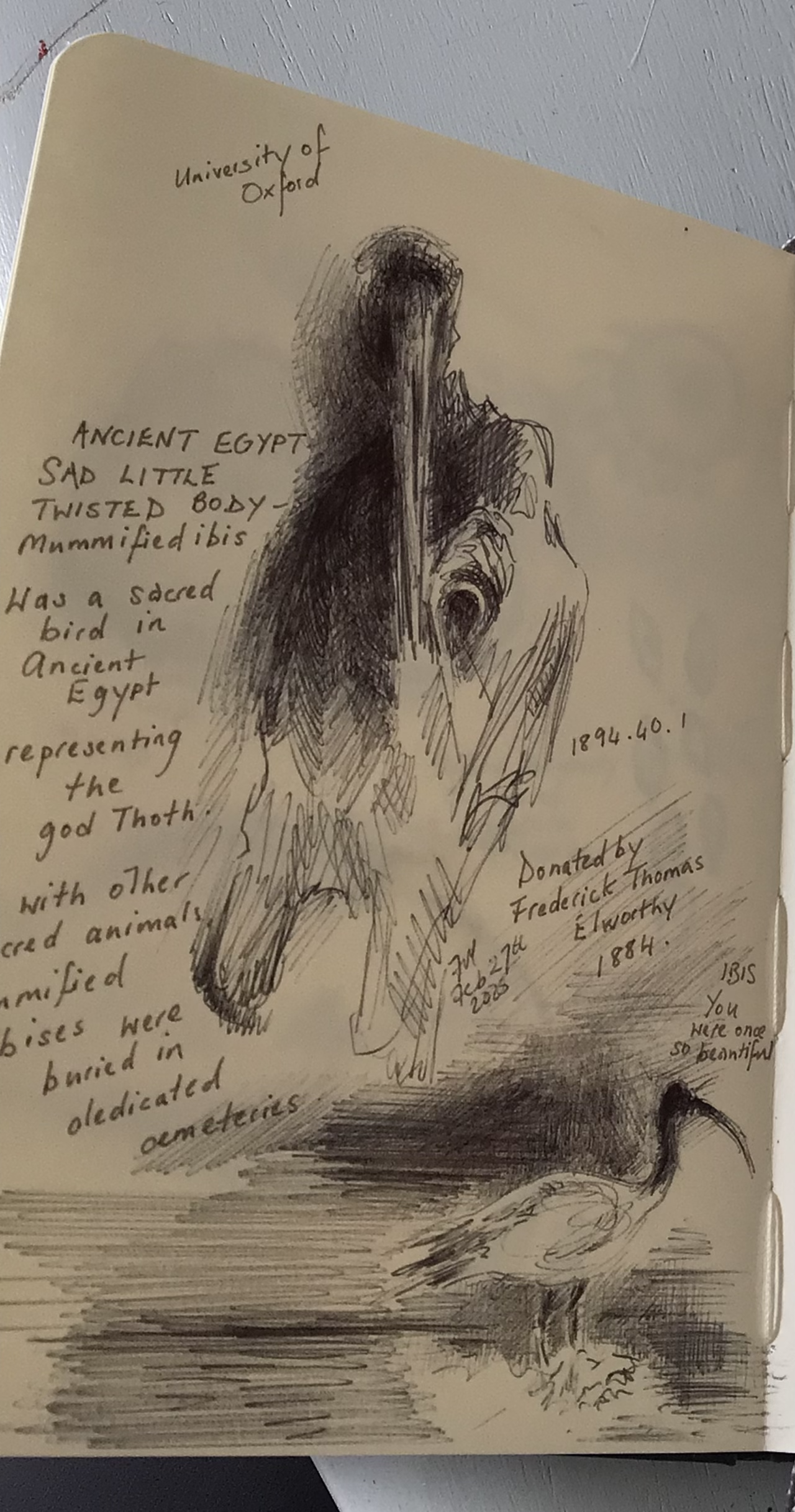 ‘Ancient Egypt. Sad little twisted body – mummified ibis. [It] Was a sacred bird in Ancient Egypt representing the god Thoth. With other sacred animals, mummified ibises were buried in dedicated cemeteries. 1894.40.1 Donated by Frederic Thomas Elworthy 1884.’ On the other side, it read ‘IBIS. You were once so beautiful.’