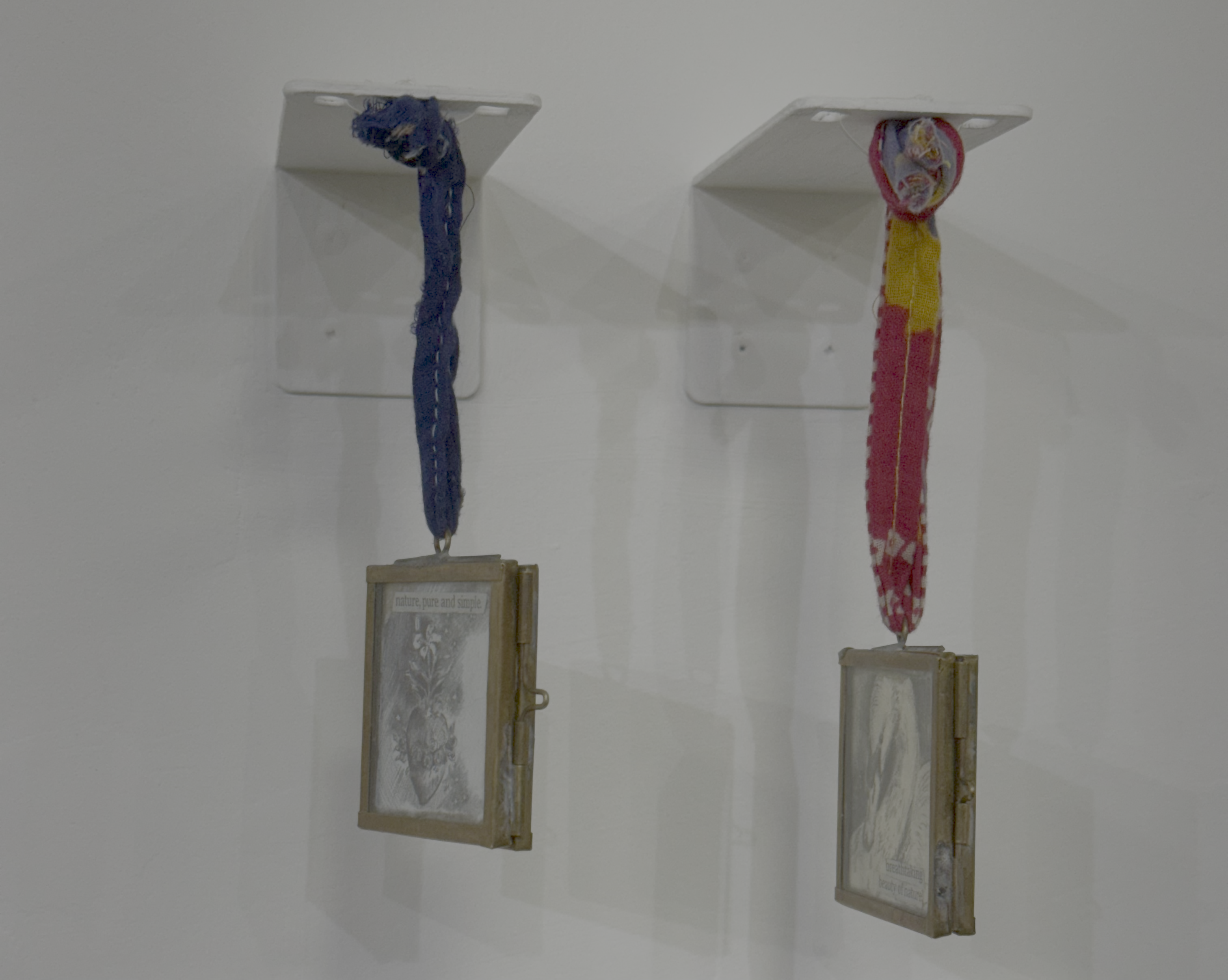 In her exhibition, nature takes the forefront — Fiona honours creatures large and small, as well as the landscapes of the Highlands, showcasing the special, awe-inspiring places, whilst still making space for the Sacred Heart and the Crown of Thorns, and other religious imagery. Her votives, two-sided brass-framed drawings, contain birds and swans, rather than saints, with small words pasted onto them: ‘love’, ‘harmony’, ‘nature, pure and simple’. It’s an interesting twist on the religious devotional images, but rather than used to subvert, she uses them to elevate those that don’t have a voice — little birds in the sky. They are still paired thoughtfully with devotional themes. The birds are paired with the Sacred Heart, and the swans are paired with the Hindu swan goddess, Saraswati.