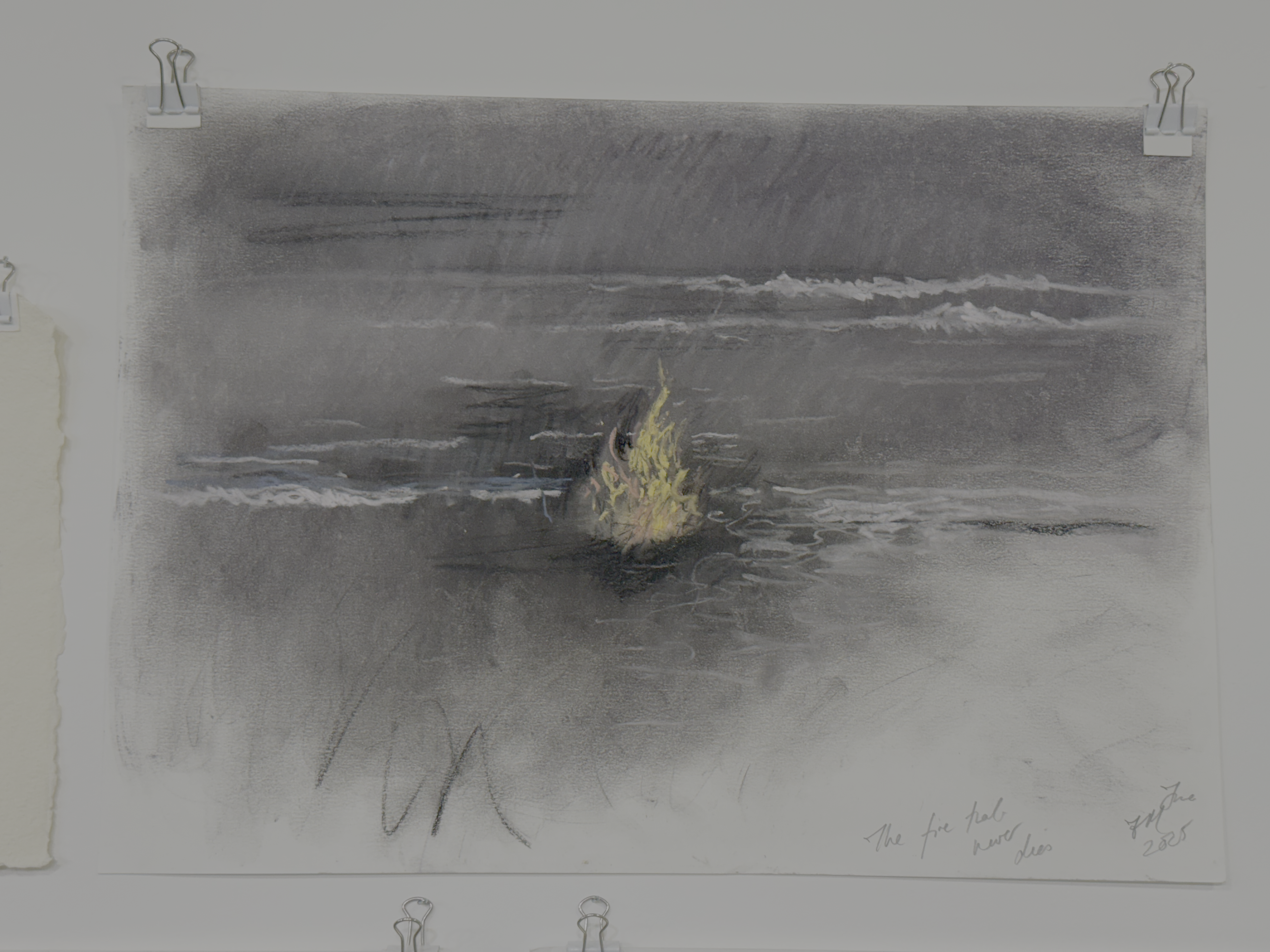 ‘Sacred’ is a devotional act. It echoes the New England transcendentalist thought of the divine meaning of nature. It is comparable to John Muir’s appreciation for everything small. Fiona naturally incorporates this into the richness and diversity of her work. She gives a voice to those unheard, the little wrens perched in the bushes, the hedgehog on the side of the road, wary of crossing it. The moors stretch across the valley, worshipping the looming mountains. And what felt almost like a conclusion — the pastel work The Fire that Never Dies — echoes the tenacity of nature, the everlasting glory of the natural world that will continue, despite the human touch that is causing harm.