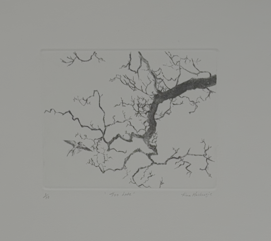 Too late, a drypoint prepared using a copper plate, shows a swallow returning to a dying tree. The piece was inspired by Oscar Wilde’s The Happy Prince and the phrase ‘one swallow does not a summer make.’ The trees are slowly dying, and so are the birds. However, if we examine the symbolism further, the swallow is also a prefiguration of Christ’s suffering on the cross, so the swallow flying towards the tree isn’t only a commentary on ecology but also has a deeper, Christian significance.
