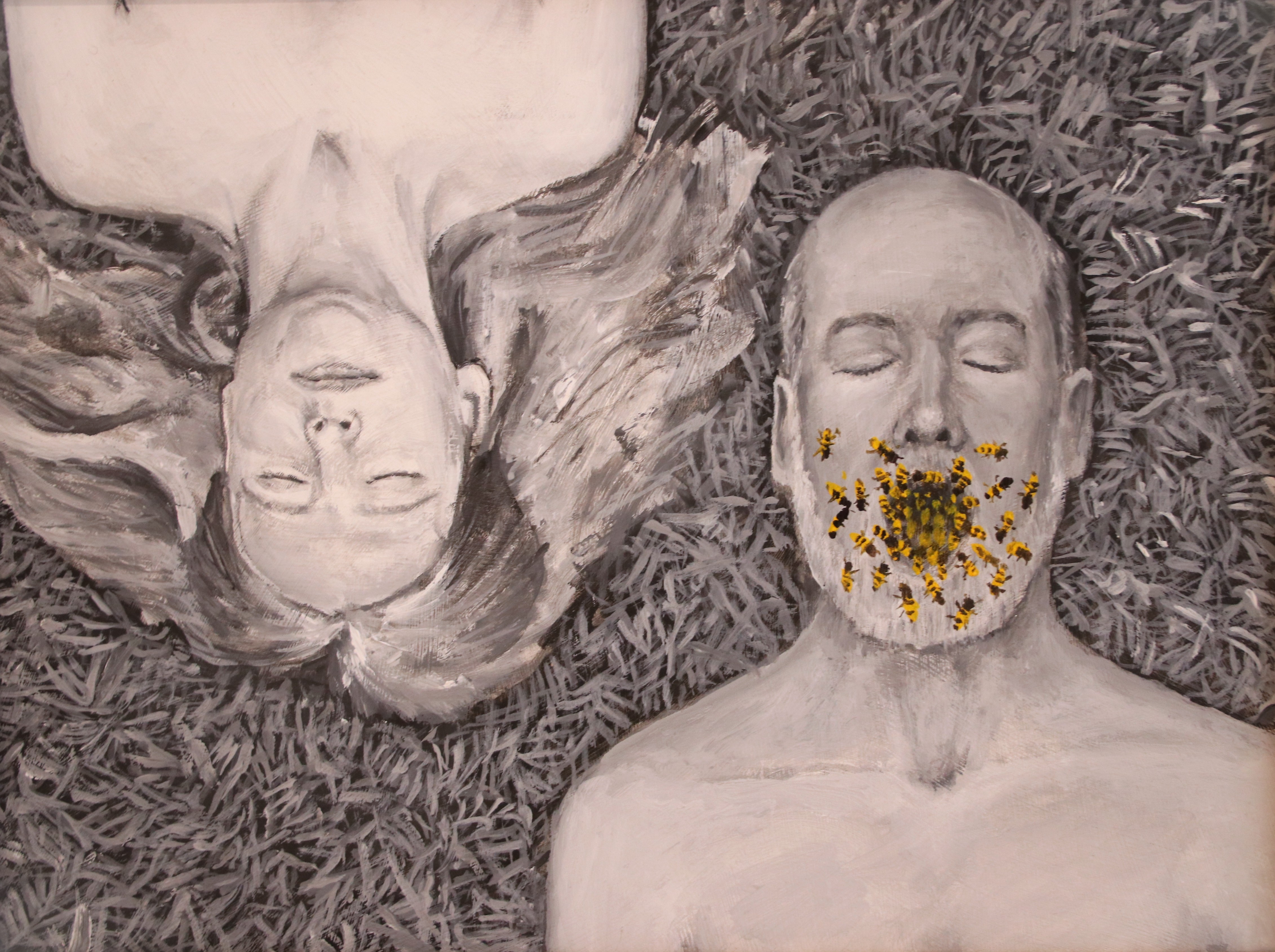Where Sam’s opening piece captures us with its sheer power and intensity, the exhibition marries it with softer, more tender work. For example, we have Emanation by Alexander Adams. A painting entirely done in monochrome except for bees flittering out of the artist’s mouth. The man lies on the field of grass next to a woman (who, as we learn, is the artist’s wife), her hair sprawled like a halo. The piece, thematically touching on grief, love, and closure, provides a welcome break from all the grand and great while maintaining its own strength.