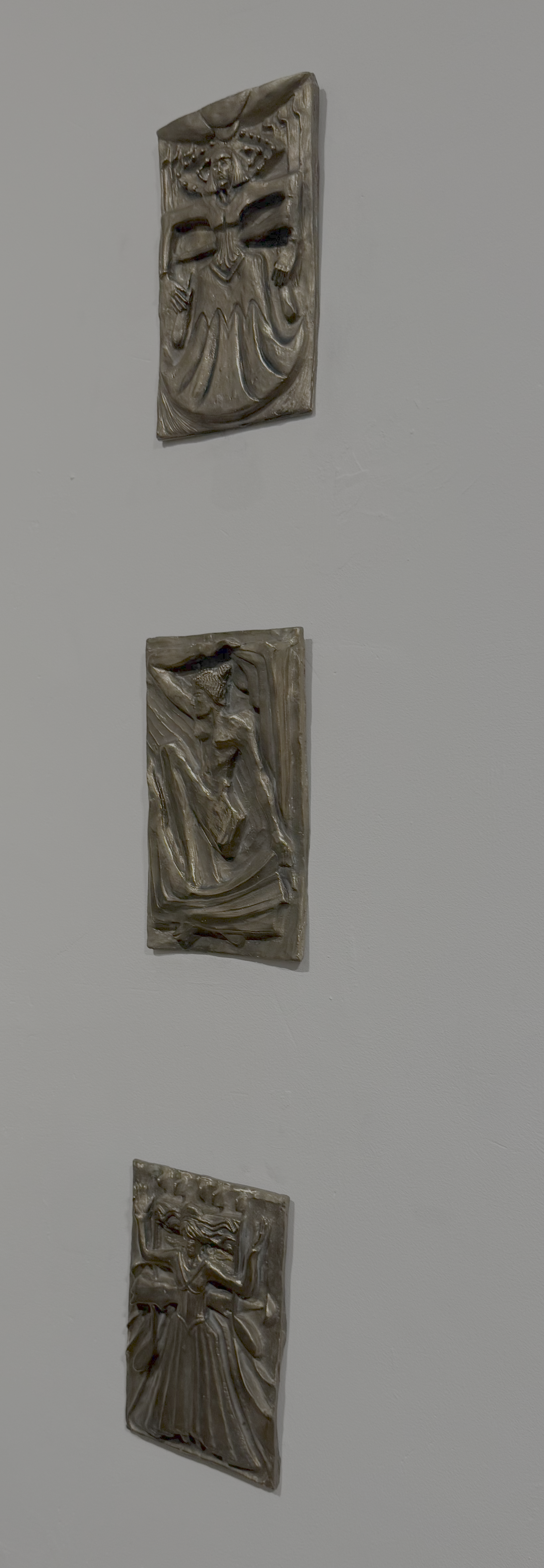 However, in my frenzy, I continued, moving away from comforting pastels and casting a glance at the other side of the room, where stood Ferro, the man known for his tapestries and sculptures. Sporting a Russian-style hat and a uniform, he guided us through the works, relishing in the opportunity to explain the symbolism of treasures on display. Across the wall, there sprawled a large tapestry with a gryphon and near the window, a large Byzantine-inspired double-headed eagle rested, bejewelling the rest of the room. But what really got my attention were the muses — three bronze plates representing a muse for a different discipline. I will leave it to the reader to guess what they symbolise for the air of mystery, but I will say, there are sounds, stars, and movement captured within them.